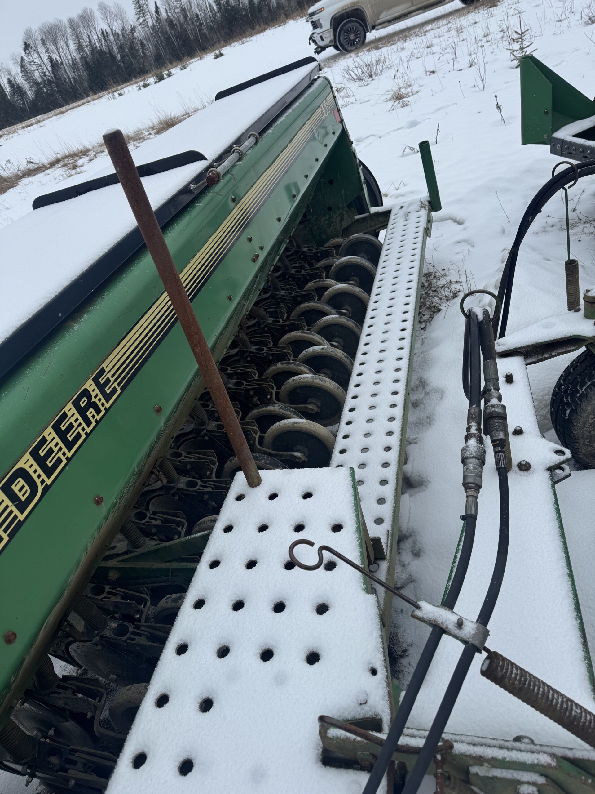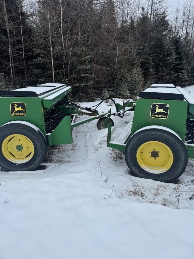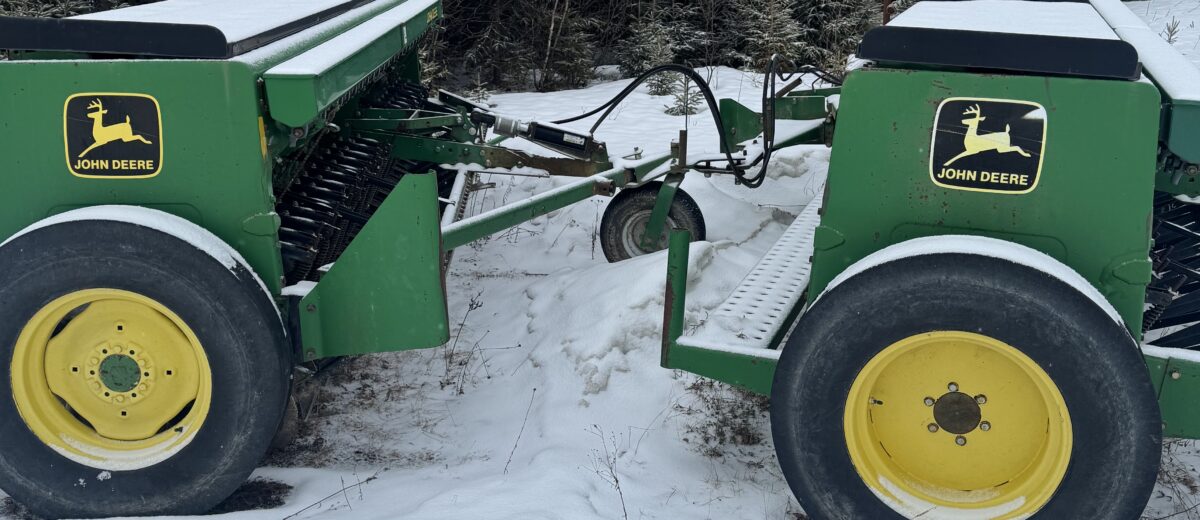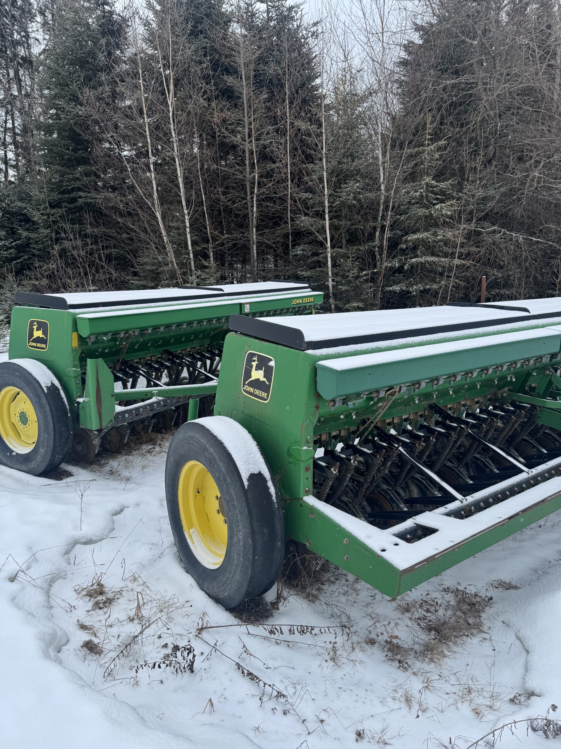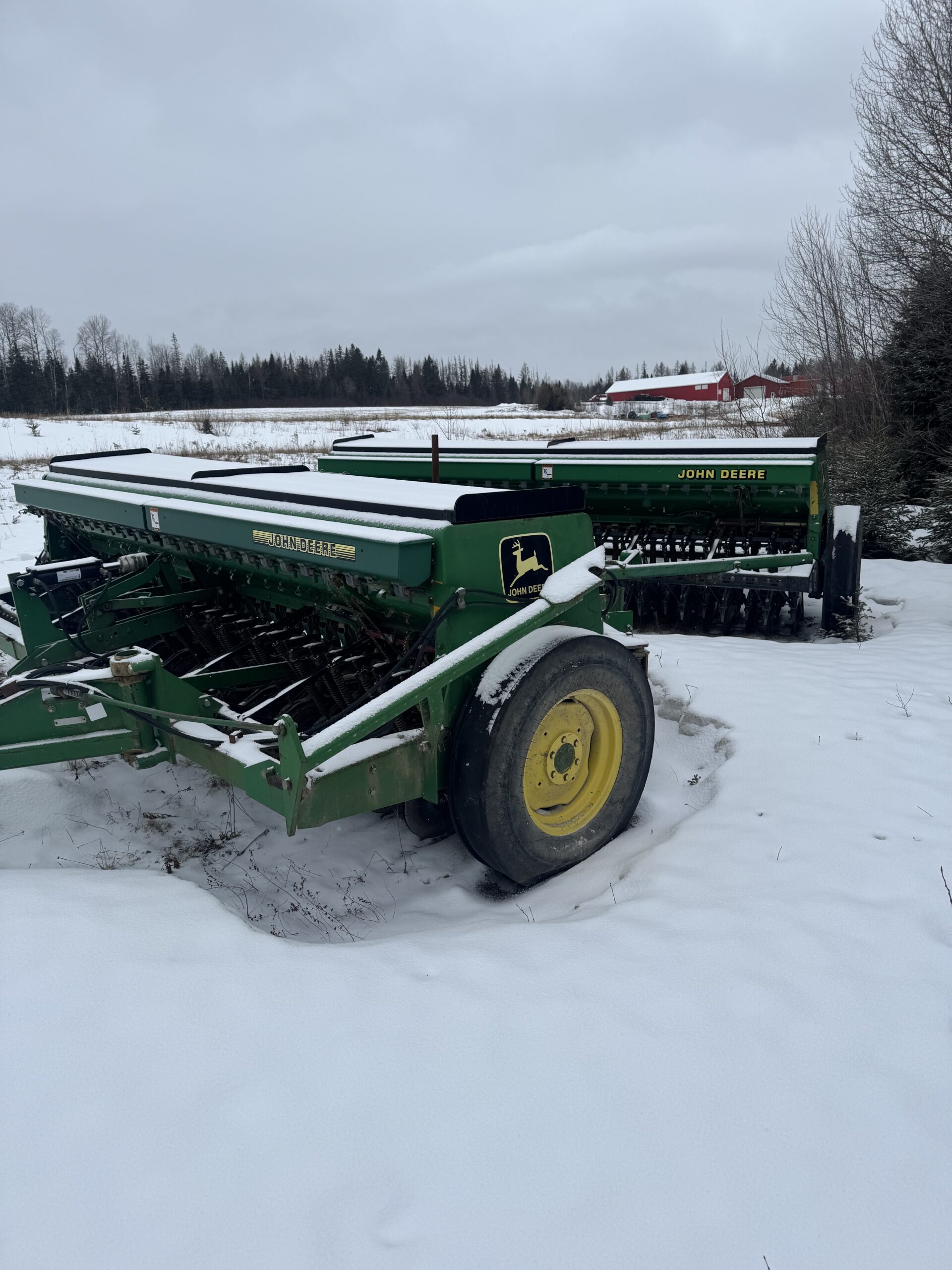 John Deere 450 double grain drill. Press wheels, no fertilizer, will plant 25 acres per filling. Tracks great. $8500