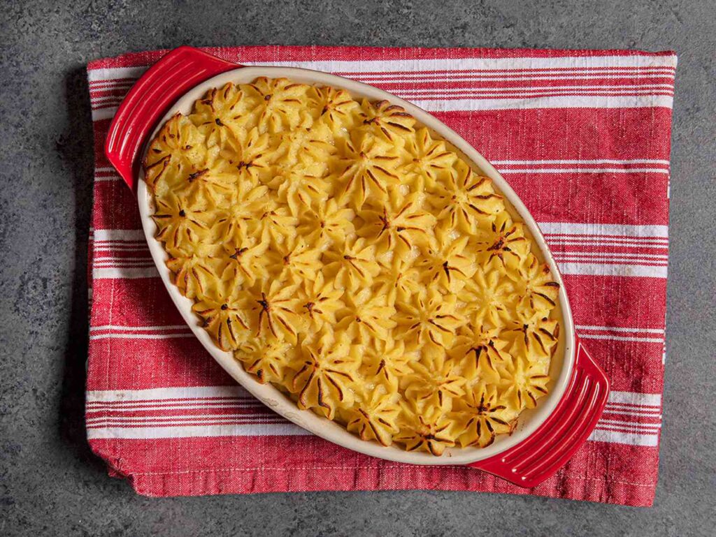 Line a baking sheet with parchment paper. Using a pastry bag or resealable plastic bag and a large star tip, pipe potatoes into six mounds on the baking sheet.